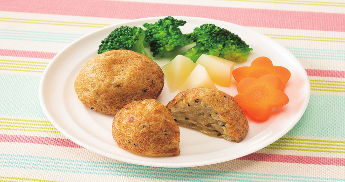 北海道産小麦を使った生地に国産すけそうだらすり身を練り込み、丸型に焼き上げました。国産具材 (ひじき、キャベツ) を使用。