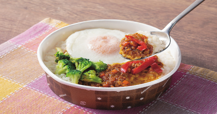 13種のスパイスを使用したスパイシーなキーマカレーです。半熟目玉焼き風たまごと2種の