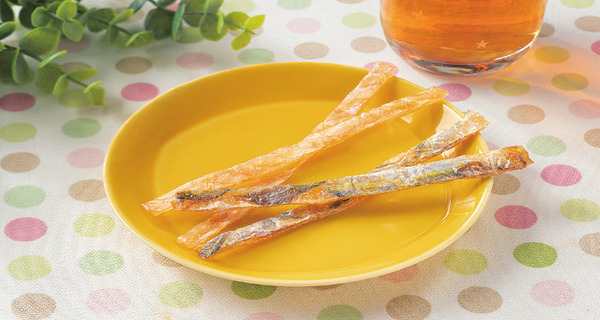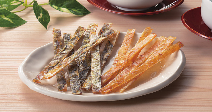 あじとかわはぎの2種の魚を味付けし、シート状にして焼いてからそれぞれ細長く食べやすい