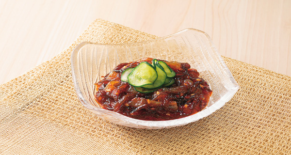 コリコリ食感のくらげと、太くぬめりのある沖縄県産もずくを香味野菜 (にんにく、玉ねぎ、生姜) 果実 (りんご) 、魚介エキスなどをバランスよく混合したキムチ調味料と和えました。